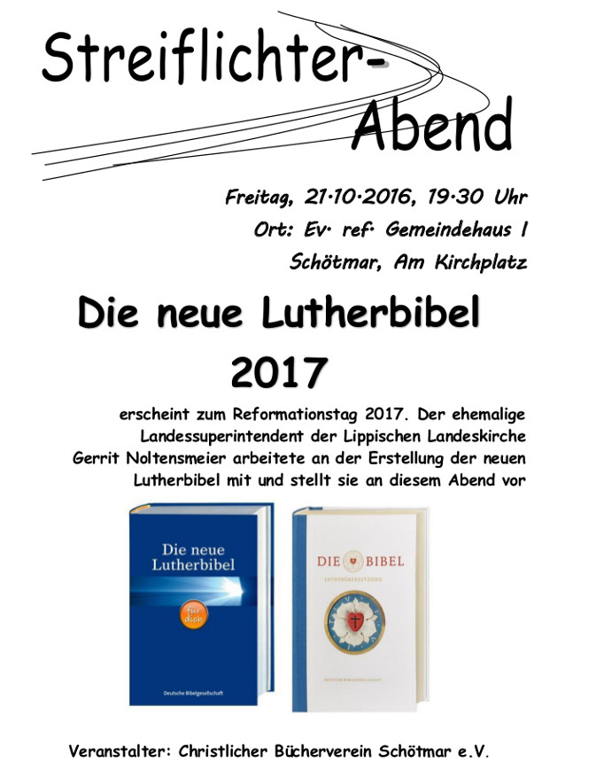 Zum Reformationstag 2017 erscheint die neue Lutherbibel und wir konnten dankenswerterweise Herrn Gerrit Noltensmeier, ehemaliger Landessuperintendent der Lippischen Landeskirche und Mit-Ersteller dieser Bibel, am 21.10.2016 bei uns als Gast begrüßen!